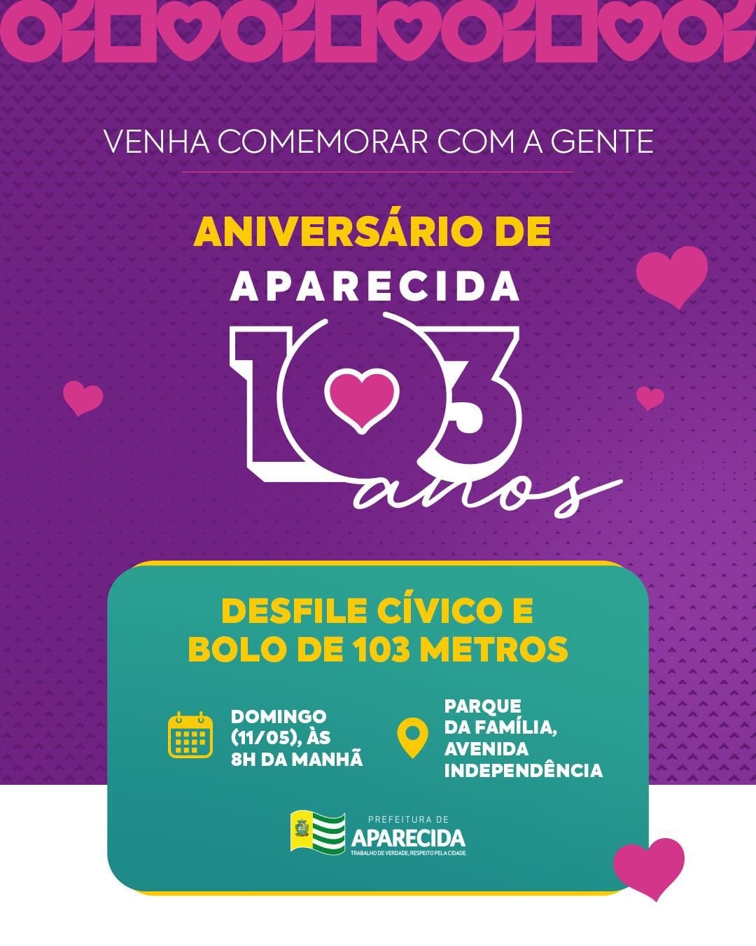 A prefeitura de Aparecida de Goiânia celebra os 103 anos da cidade neste domingo, 11 de maio, com o tradicional desfile cívico e o corte simbólico do bolo de aniversário. A comemoração começa às 8h no Parque da Família, na Avenida Independência, com o parabéns coletivo das mais de 5 mil pessoas esperadas para o evento. Neste ano, a novidade é a distribuição de 5 mil potes individuais de bolo, garantindo mais organização e higiene na celebração.