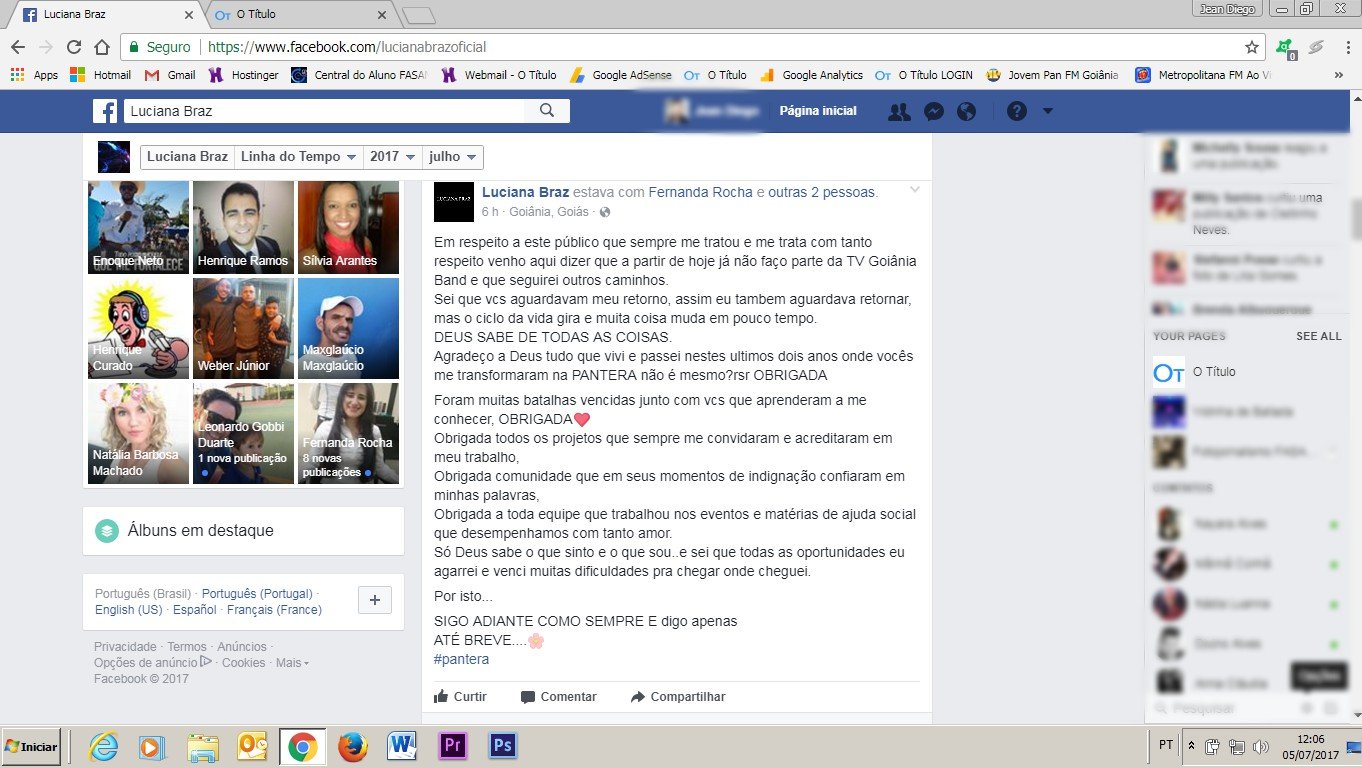 Luciana foi ao seu facebook na manhã de hoje dizer que não faz mais parte da emissora, “venho aqui dizer que a partir de hoje já não faço parte da TV Goiânia Band e que seguirei outros caminhos.
